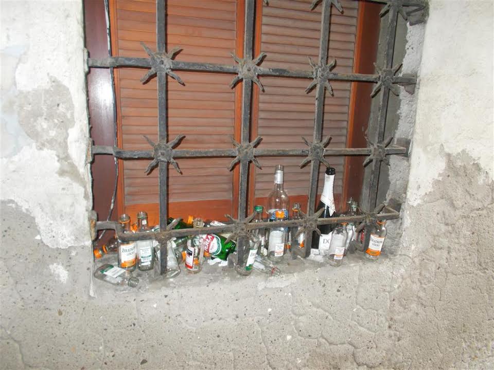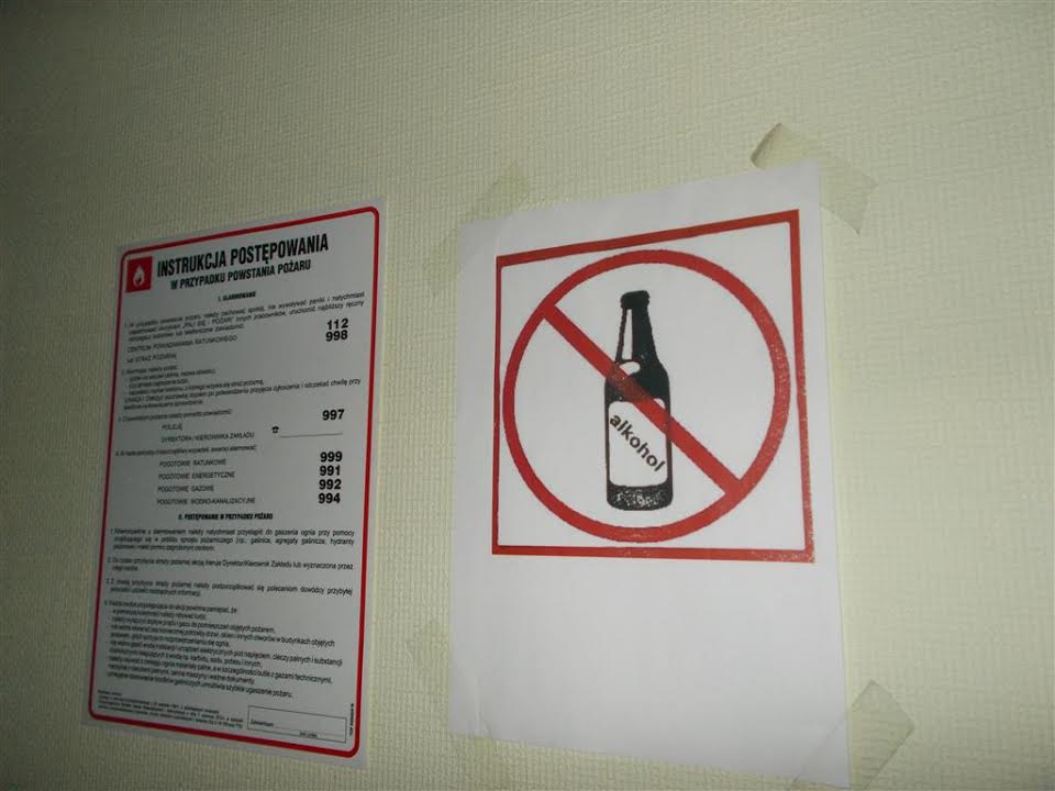 Tuż obok tablica informująca, że to miejsce jest „uświęcone krwią Polaków”. Naprzeciw tablicy okno.: