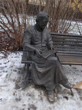 Ksiądz Twardowski na pobliskiej ławeczce. Robiłem z nim kiedyś wywiad w jego mieszkaniu, sto metrów dalej.: