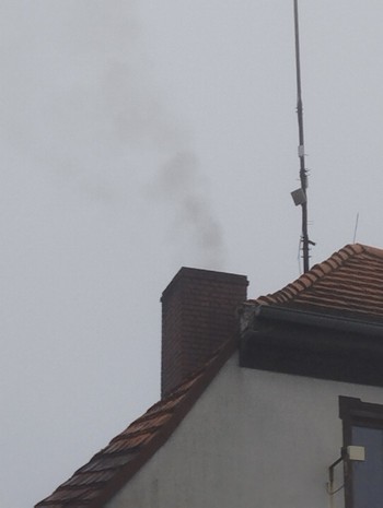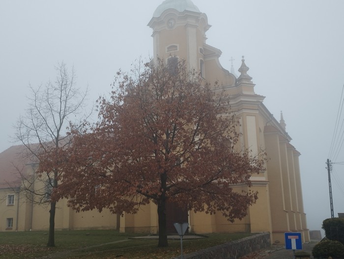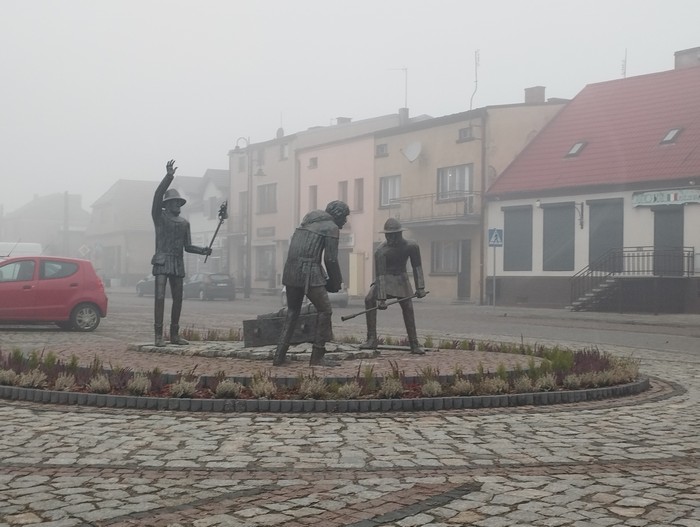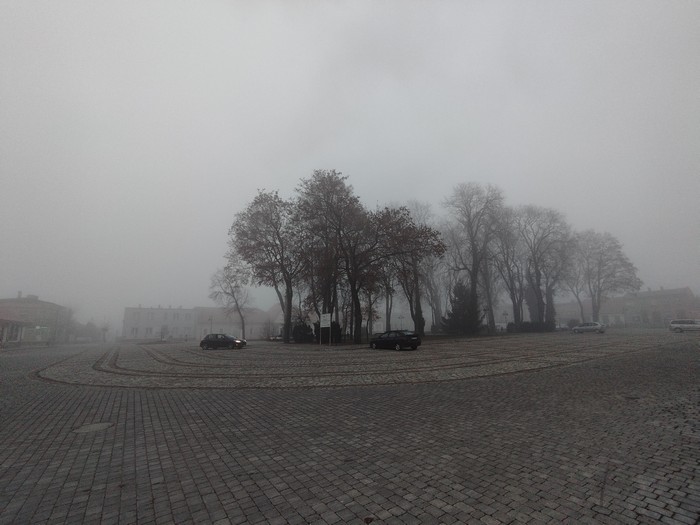 Miasteczko Pyzdry, południowa Wielkopolska. Żeby się ruszyć z domu. Kiedy byliśmy tu poprzednio zimą, trzeba było uciekać, bo dym aż zapierał dech. Tym razem podobnie, z tym, że wdała się na to wszystko ogromna mgła.:
