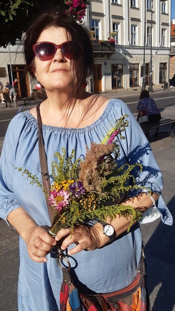Hotel w Piotrkowie Trybunalskim. Cud nad Wisłą obecny na każdym kroku. Przed kościołem bernardynów starsza pani sprzedaje bukiety z polnych kwiatów. Zanim mój ospały mózg pojmie, że to na ołtarz w Matki Boskiej Zielnej, Dorota dostaje wiązankę. Boska!: