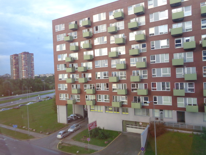 Wczoraj w Białymstoku mieliśmy hotel (bardzo przyzwoity) na skrzyżowaniu ulic Hurtowej i Składowej. I tak się powinny nazywać ulice, nie trzeba by zmieniać nazw co sezon. Dziś w Wilnie bardzo przyzwoita sieciówka „Green Hotel”, ale widok z okna dowodzi, że tutaj też „w domach z betonu nie ma wolnej miłości”. Wczoraj w Wierszalinie obejrzeliśmy sobie, co się wyprawiało w celi Konrada, więc tym razem ją sobie odpuściliśmy. Tylko Prospekt Gedymina (takie ichnie Krakowskie Przedmieście). Filmowane od stolika jak na Piotrkowskiej.: