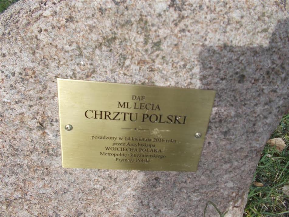 Osobliwość z wczoraj. Lednica. Kamień, na nim mosiężna tabliczka, która informuje, że obok rośnie dąb rocznicowy – uwaga! – „posadzony w 14 kwietnia 2016 roku przez Arcybiskupa (czemu tytuł wielką literą?) Wojciecha Polaka…”. Dokładnie tak stoi napisane.: