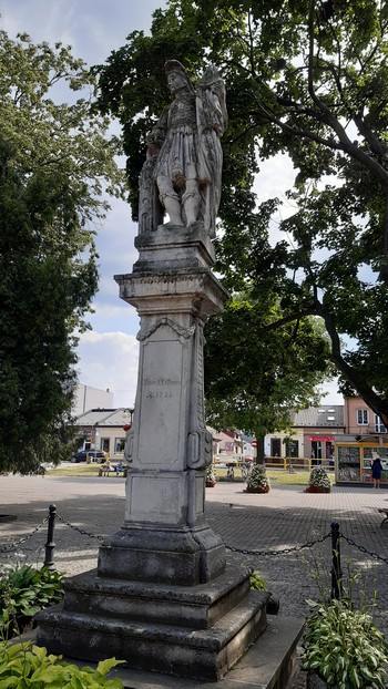 Włoszczowa.Na rynku pomnik świętego Floriana, choć nie z tym świętym miasto najbardziej się kojarzy.: