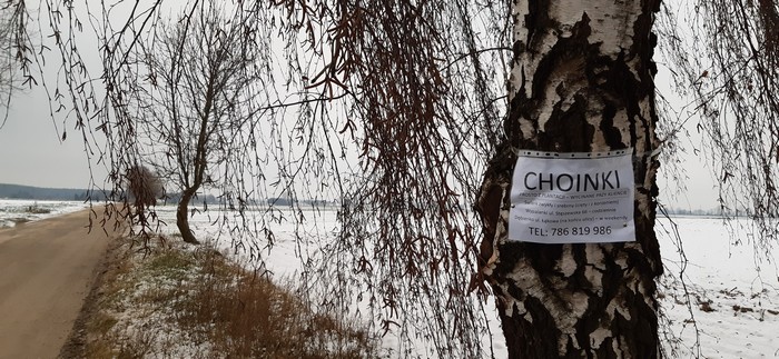 W Chomęcicach taka oto osobliwość, że przydrożna brzoza reklamuje domowe choinki.: