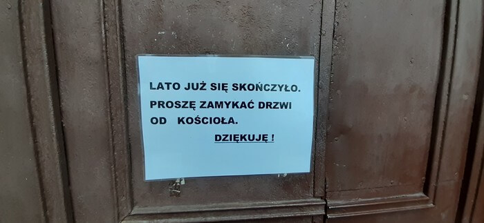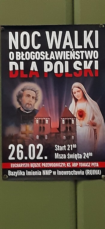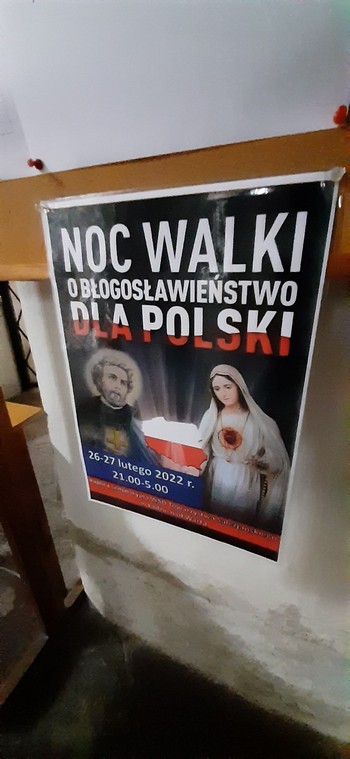 Z trasy. Ląd. Kompleks pocystreski. W nim zaproszenie na Noc Walki (nie podano z kim). Podobne widziałem w innych kościołach Wielkopolski. Nie tylko na wschodzie będzie ostro.: