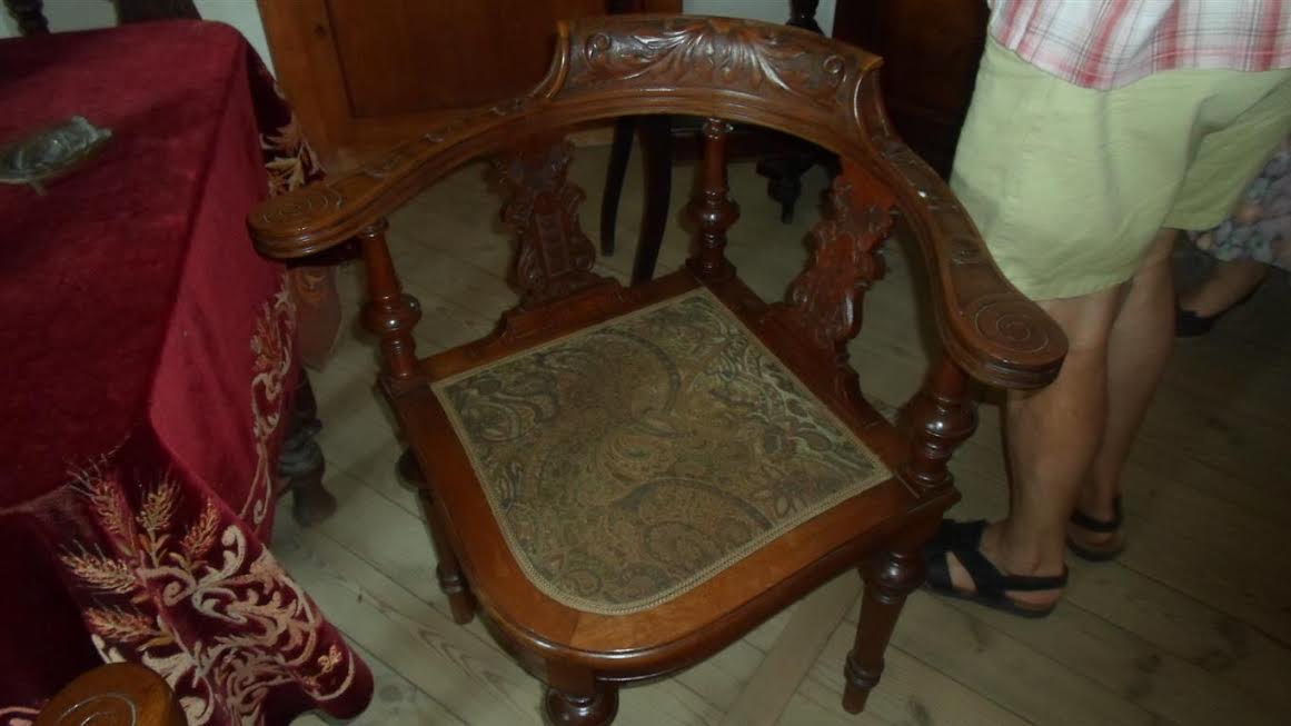 A to krzesła przy stoliku do kart. Tak wyprofilowane, żeby łatwiej było rozkładać nogi. Oczywiście – krzesła tylko dla panów.: