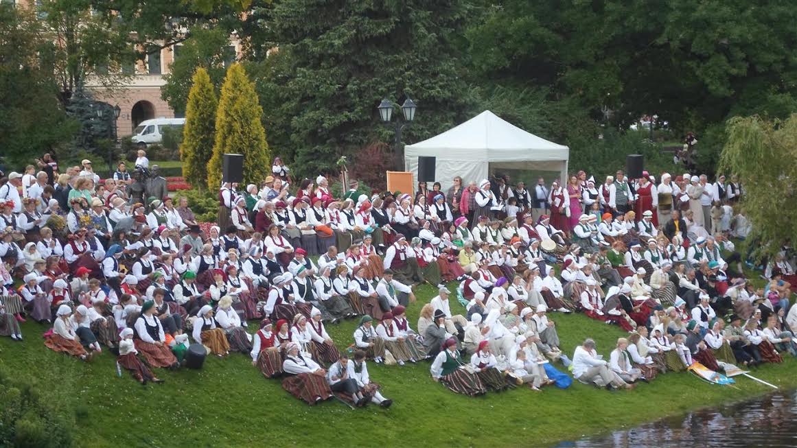 W Rydze akurat festiwal folklorystyczny Baltica 2015. Tłumy artystów ludowych z krajów nadbałtyckich siedzą w parkach i śpiewają.:
