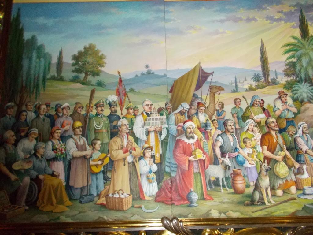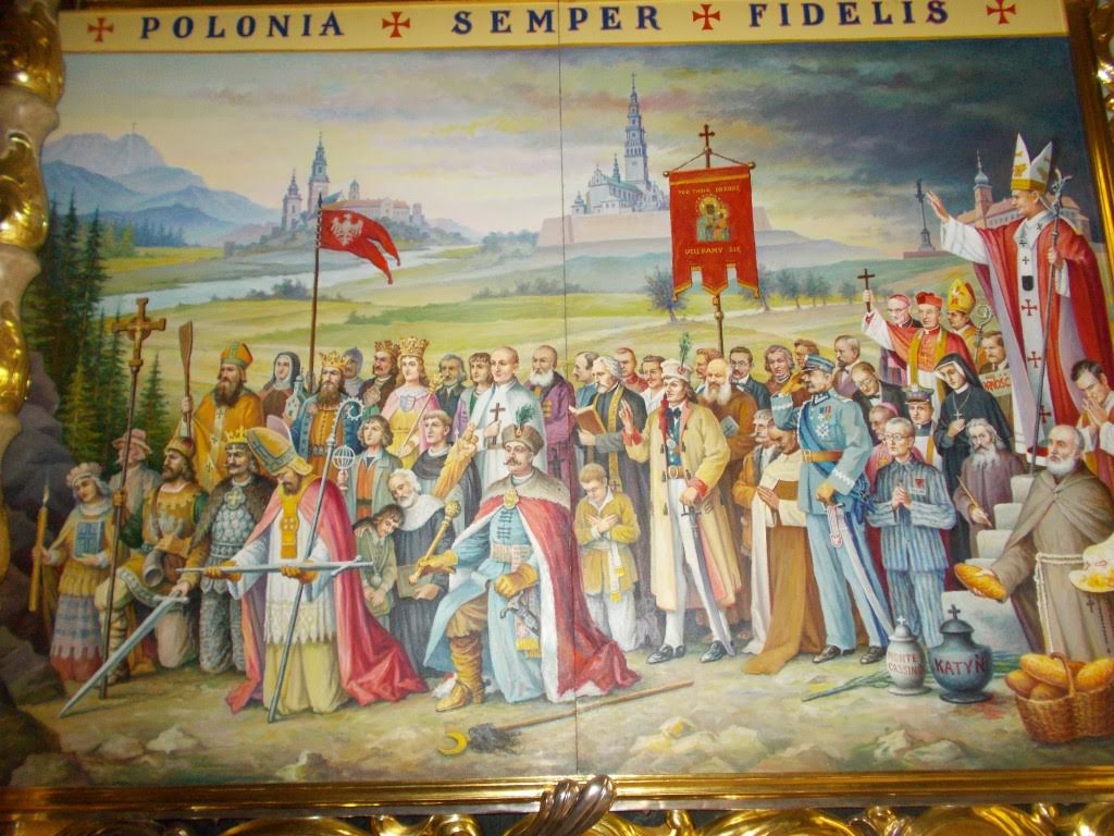 Zaległości. Licheń, malarstwo. Po jednej stronie ołtarza lud, a po drugiej dygnitarstwo. Żadnego bratania się stanów – każdy na swoim miejscu. Mogliby to namalować z 200 lat temu.: