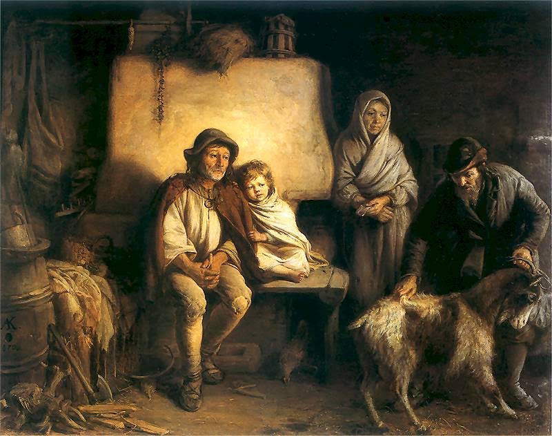 Aleksander Kotsis (+1877) „Ostatnia chudoba”. Biedna rodzina chłopska zmuszona jest pozbyć się kozy-żywicielki. Proszę zwrócić uwagę, kto rodzinie tę kozę odbiera. Połowa rodaków wypowiadających się w Internecie jest zdania, że obecnie zachodzą całkiem podobne procesy.: