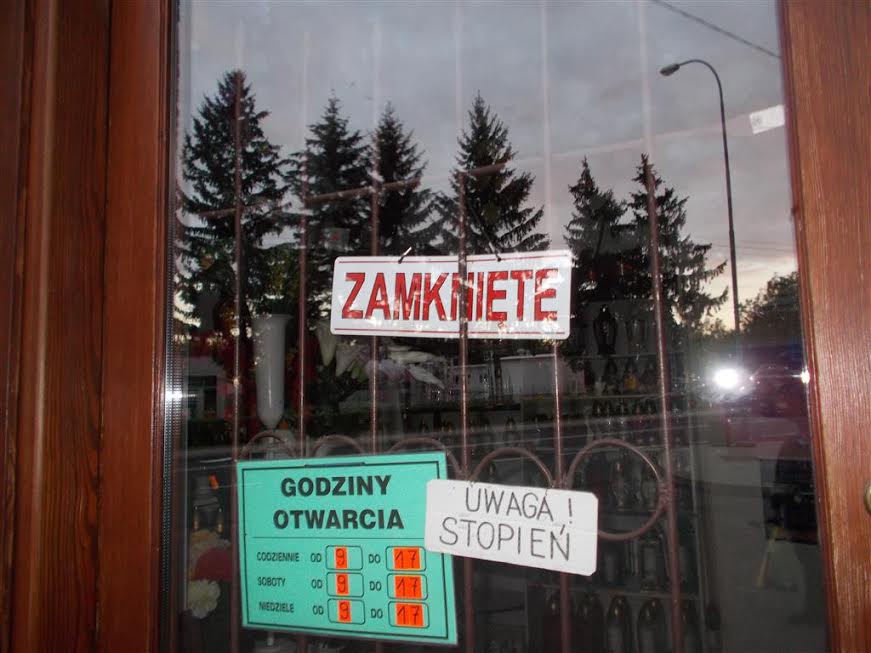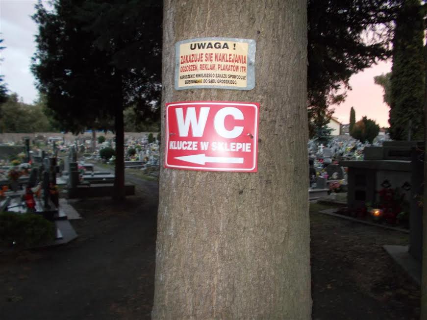 Próbuję przybliżyć Dorocie istotę mojego miasta. Okazja nadarza się na cmentarzu, gdzie poszliśmy na grób rodziców. Oto informacja jak uzyskać klucz do WC.: