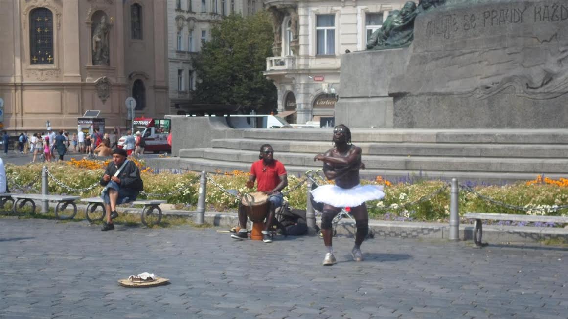 W Pradze największe wrażenie robią wydarzenia kulturalne. A z wydarzeń kulturalnych najdonioślejszy był taniec tego Murzyna w białej spódniczce przed pomnikiem Jana Husa w samym sercu Starówki.:
