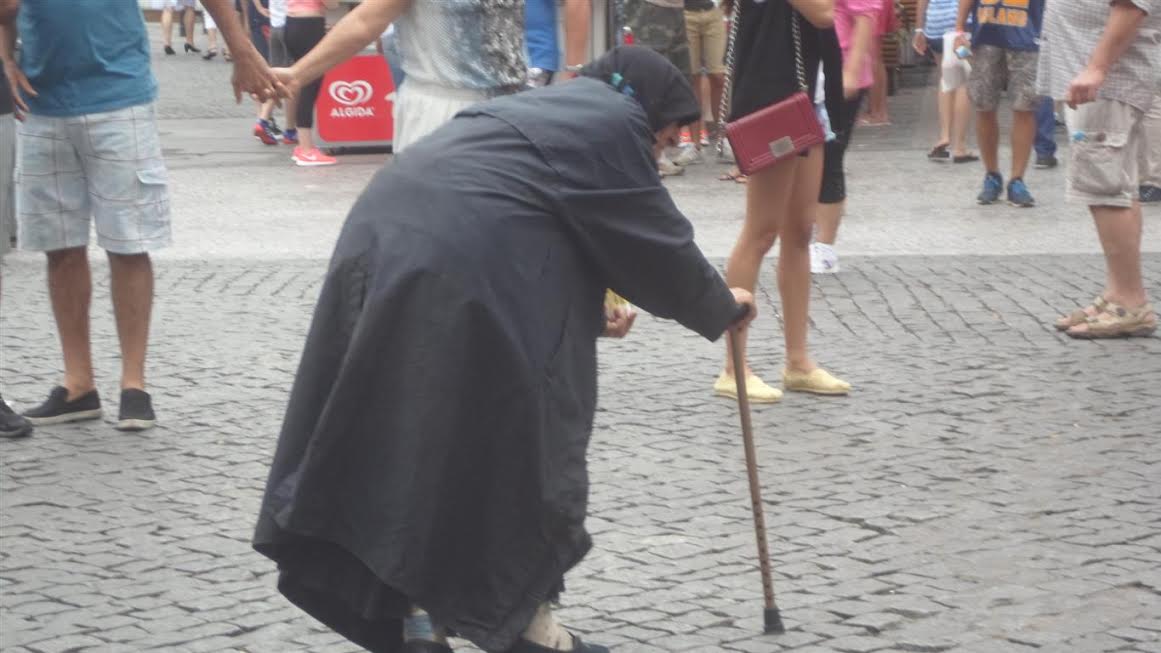 Wśród tysięcy rozszczebiotanych turystów pani, która zbiera na chleb (?). Nie zdziwiłbym się, gdyby powtarzała: „Memento mori!”.: