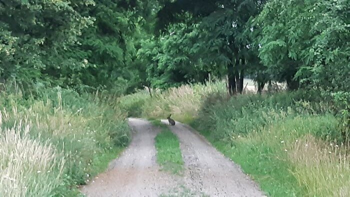 Las, szósta rano. Nagle na ścieżkę wskakuje zając Władek. Założę się, że łajdak wraca dopiero z wczorajszej imprezy.: