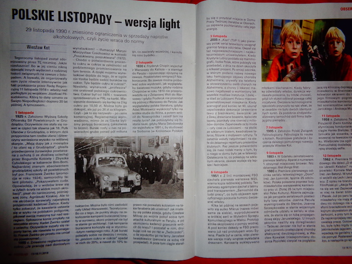 W tygodniku Przegląd o niesłusznie zapomnianych listopadowych rocznicach. „29 listopada 1990 zniesiono ograniczenia w sprzedaży napojów alkoholowych wprowadzone przez władze 2 grudnia 1982 roku. Zdarzało się, że zakazu przestrzegano aż nadto rygorystycznie. W słynnym krakowskim „Wierzynku” nie podawano gościom przed 13.00 pewnych deserów, ponieważ zawierały kilka kropel koniaku. A jednocześnie lokalnie zakazywano sprzedaży przed tą godziną politury stolarskiej czy płynu „Autovidol” do czyszczenia szyb samochodowych. Teraz wódkę znów można było kupować przed 13:00.