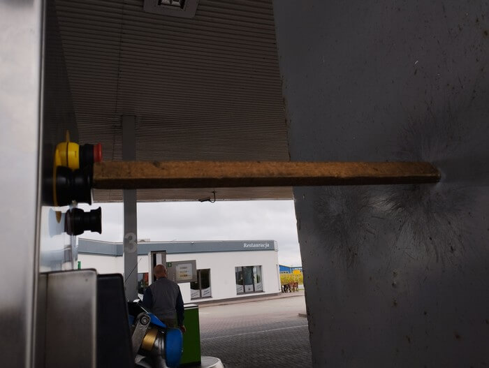 Polak potrafi! Stacja benzynowa. W trakcie tankowania gazu zawsze muszę przytrzymywać przycisk (z wyjątkiem tych dystrybutorów, które sprytny pan pompiarz opasze obręczą z gumy). A tu, pod Strzelnem pan unieruchamia przycisk specjalną deseczką dociskową. Wyjmuję aparat, a on z miejsca, że to jego patent i żebym go nie rozpowszechniał!: