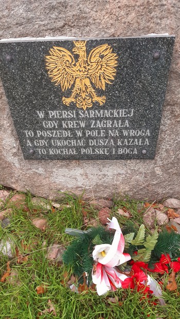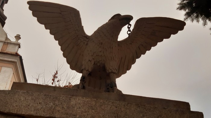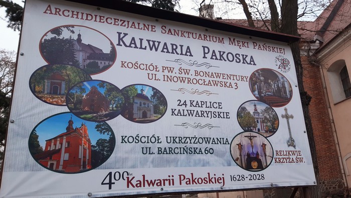Wreszcie cel podróży – Kalwaria w Pakości. Informację o niej powzięliśmy z ulotki wyłożonej w kościele w Lubaszu. Z kalwarii na „Pa” znaliśmy dotąd (i to więcej niż gruntownie) Kalwarię Pacławską (30 km za Przemyślem). A tu Kalwaria Pakoska, o której w ogóle nie słyszeliśmy. Skandal! A to tu jest m. in. orzeł, który nie tylko pręży skrzydła jak nie przymierzając kogut na podwórku, ale też robi cos pożytecznego. Ten zerwał własne kajdany. Dziobem!: