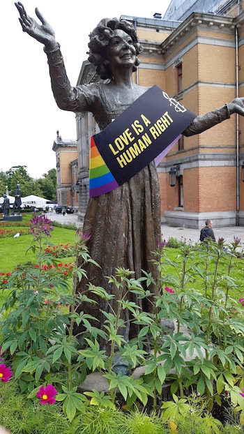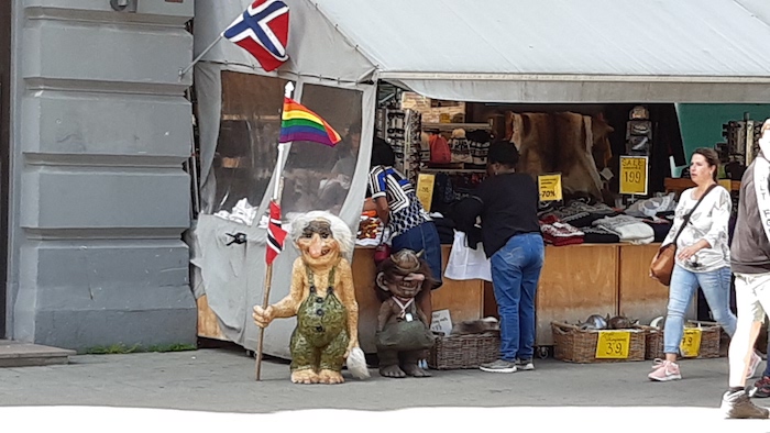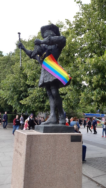 Kwestia nieporówanie bardziej drażliwa to napastliwy skadynawski Gender, LGBT i podobne miazmaty. Wciskają się wszędzie. W centrum Oslo wstapiliśmy do Tęczowego Miasteczka, gdzie swoją obecnością cieszyli się najromaitsi hipsterzy – od homo przez les po trans, dalej nie będę wyliczał. W bramce musieliśmy się poddać powierzownemu obszukanku. Nie rozumiem dlaczego, przecież każde z nas swoje emblematy płciowe miało przy sobie, choć ich nie okazywało. W środku było miło, ale jakoś nie miałem śmiałości fotografować, choć było co. A poza tym tego jedynego zapachu, jaki unosił się w powietrzu – z racji spalania roslin trawiastych – nie da się sfotografować. Ale też w Oslo właściwie nie ma pomnika, statui, rzeźby, które nie opasywałaby dumna tęcza. No i widuje się plakaty, które u nas by długo nie powisiały…: