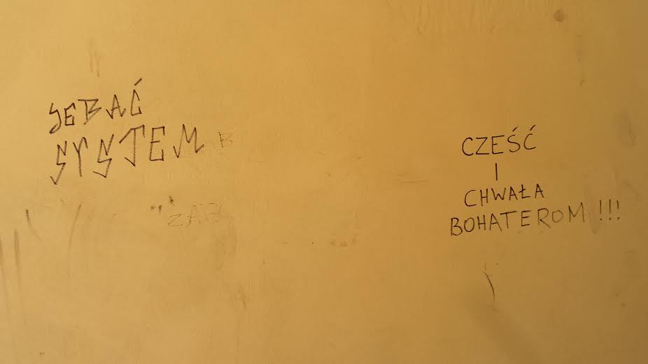 I wreszcie pstryknąłem jedną (!) ścianę. Ktoś zmieścił na niej zapewne dwa główne nurty obecne w umysłach obywateli rodzinnego miasta Marii Konopnickiej. Jedno z tych haseł wyjaśniło przy okazji, dlaczego Suwałki zwane bywają w okolicy „Posuwałki”.: