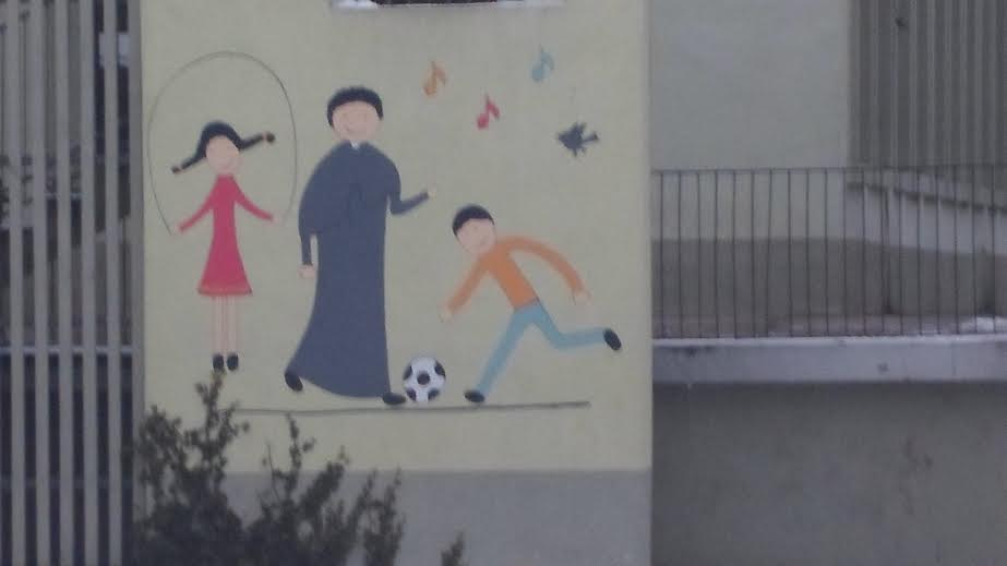 Malunek na ścianie katolickiego przedszkola (?) na Sołaczu. Właściwie nie ma tu nic nadzwyczajnego. Ot, ksiądz bawi się z dziećmi. Dlaczego ja to fotografowałem?: