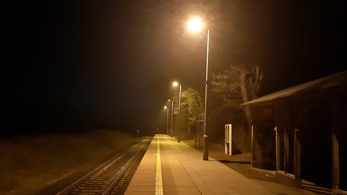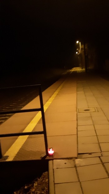 Na peronie w Rosnówku ktoś zapalił lampion. Może ku pamięci kogoś, kto z tego miejsca przeniósł się do wieczności. Odjechać w nadprzestrzeń z peronu w Rosnówku? Perspektywa całkiem do przyjęcia.: