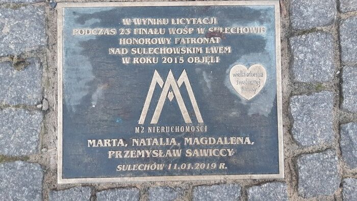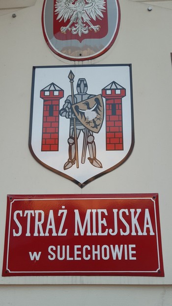 Z trasy. Sulechów (Zielonogórskie). Tu Lew Na Ratuszu ma swoich patronów, a nie jak koledzy z zoo. No i straż miejska wzorzec umundurowania ma zastrzeżony w herbie.: