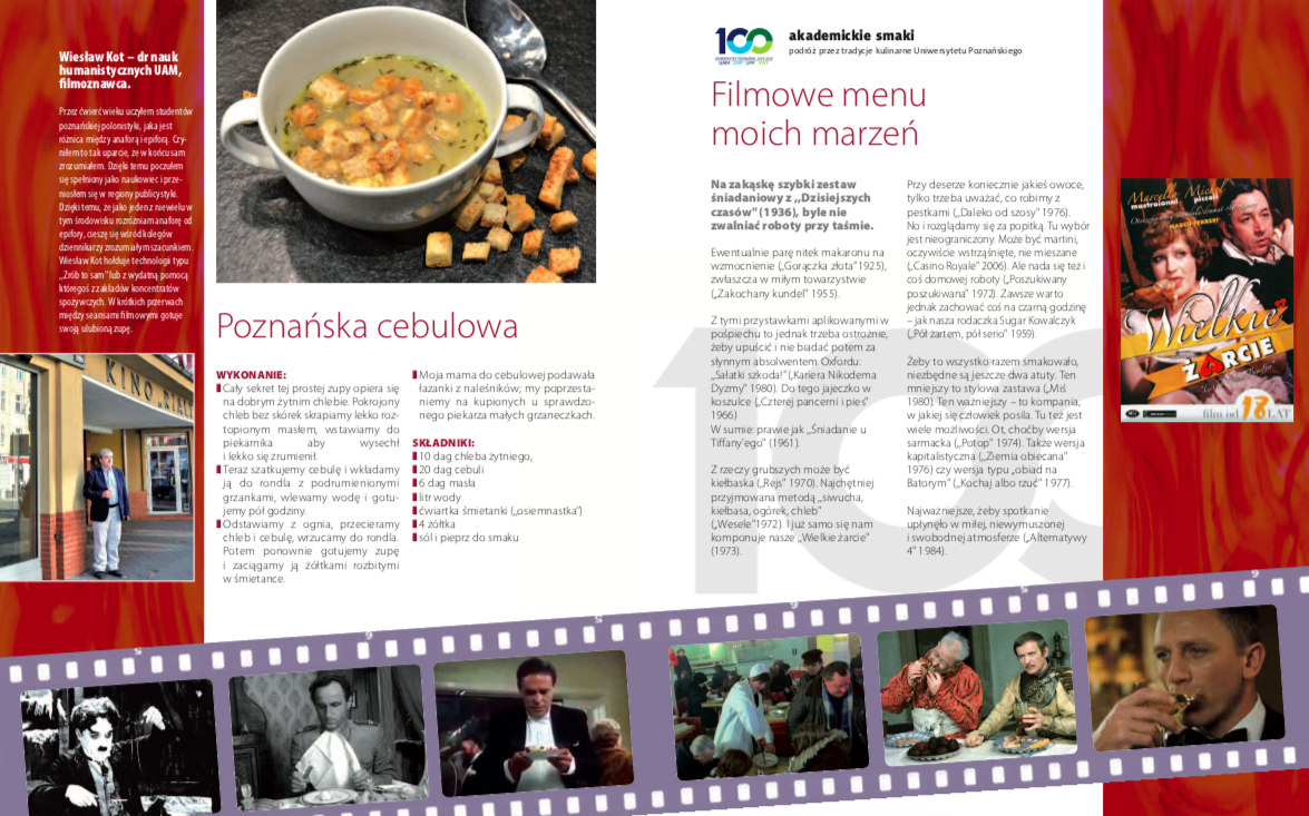 Gotowa jest książka kucharska skomponowana na stulecie poznańskiego Uniwersytetu (pracowałem tam ćwierć wieku). Poproszono mnie, bym opisał swoje ulubione danie. Wykręciłem się polecając dania filmowe.: