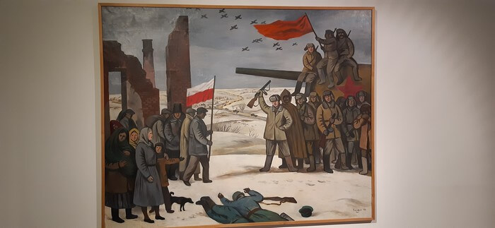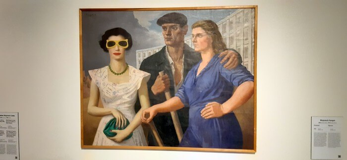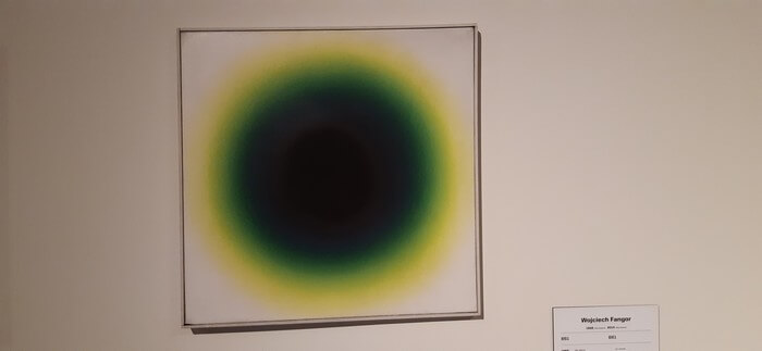 Łódź. Manufaktura, Muzeum Sztuki Współczesnej. I – przykładowo – Wojciech Fangor najpierw w czasach socrealizmu malował obrazy zupełnie niezrozumiałe i dopiero po latach zaczął się posługiwać jasnym językiem sztuki wspólczesnej.: