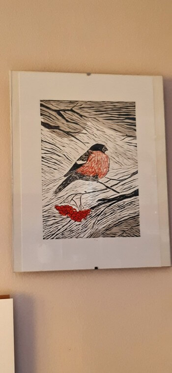 Na ścianie zawisł obrazek gila z Muzeum Papiernictwa w Supraślu.: