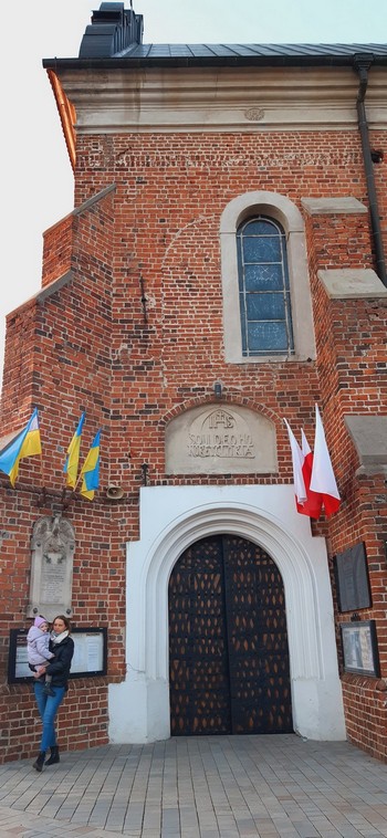 Z trasy. Pielgrzymowaliśmy do grobu bł. Bogumiła w kościele w Uniejowie. Nie weszliśmy, bo trwała liturgia, ale z satysfakcją odnotowaliśmy dekorację.: