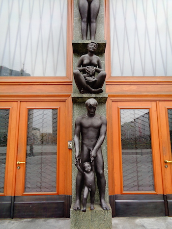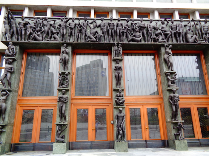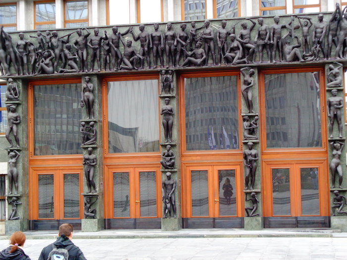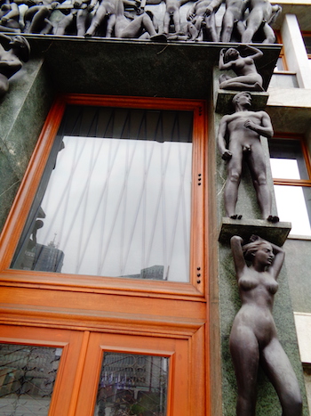 Z podróży. Brno. Jakiś ważny (i zabytkowy) budynek państwowy (tabliczki brak), pilnowany przez wartownika. Odrzwia bogato rzeźbione w figury. Tylko wszyscy na golasa. Cóż to może być? Na kościół parafialny nie wygląda…:
