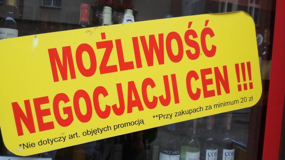 W Świdnicy sklep monopolowy z interesującą ofertą. Niestety, negocjacje są możliwe – jak widać – w przypadku zakupu za co najmniej 20 złotych. Tymczasem negocjowaliby pewnie najchętniej ci klienci, którzy mają w kieszeni dwa złote: