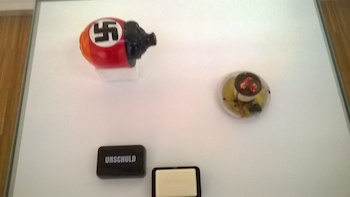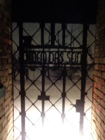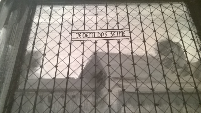 W kwestii tych obozowych napisów… Buchenwald (swoją drogą miła nazwa). Napis na bramie z fotografii w Centrum Dokumentacji Faszyzmu i z obrazu w Muzeum (oba z Norymbergi).: