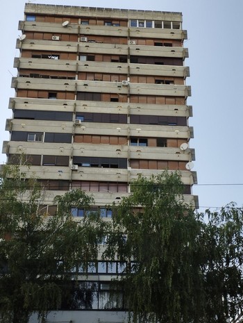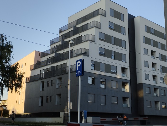 Na parkingu hotelowym w Zagrzebiu rzut oka na architekturę jugosławiańską i chorwacką.: