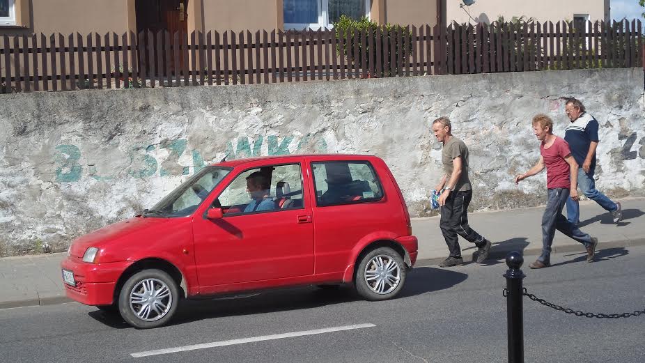 Dwa dni temu w uroczym miasteczku Skoki byliśmy świadkami, jak trzej mężczyźni dziarsko pchali pod górę czwartego, który siedział w cinquecento. Dorota sfotografowała ich w momencie, gdy auto już zaczęło toczyć się po pochyłości.