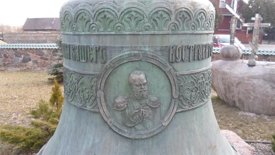 Drobiazgi. Podlasie. Dzwon obok cerkwi. Na katolickim byłby wizerunek jakiegoś świętego. Tu – car batiuszka.: