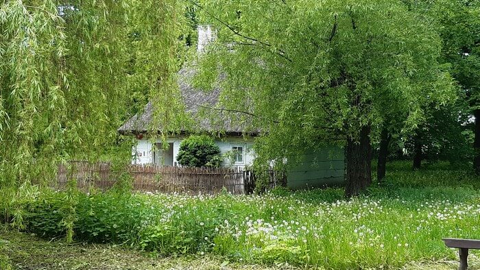 Russów koło Kalisza. Dworek, w nim muzeum Marii Dąbrowskiej, dookoła park i skansen.: