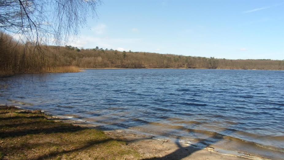 Jezioro Góreckie błękitne jak ultramaryna, bo odbija bezchmurne niebo.:
