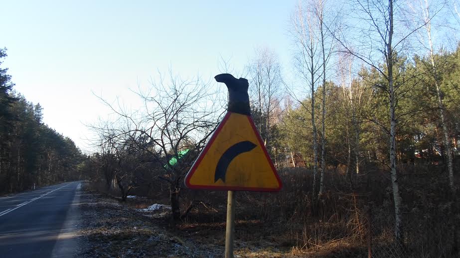 Tuż za Żelazową Wolą – błąd w oznakowaniu drogowym. Bo gumiak jak by szedł w lewo, a droga skręca w prawo. Ale: Tylko pod tym butem, tylko pod tym znakiem…: