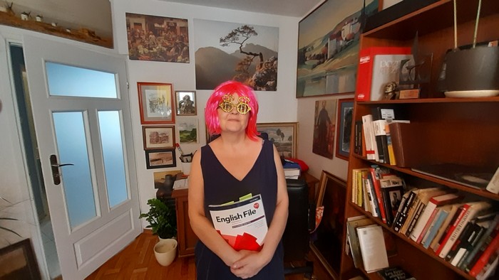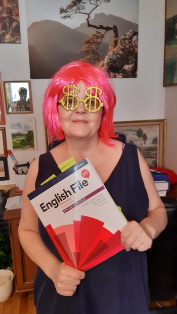 Wcześniej Dorota miała absolutorium z angielskiego. Ostatnio było tylko w sieci, ale kursanci się nawzajem (z panią prowadzącą) widzieli, więc na finał zrobili sobie „zielone konwersatorium”. Znaczy – każdy się przebierał. Oj, już ja widzę tę naukę…: