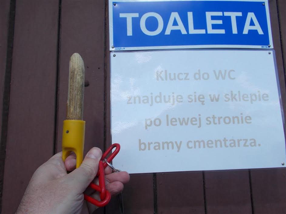 Na cmentarzu jest ubikacja, z tym, że klucz trzeba pobrać w pobliskim sklepiku. Z tym, że jeżeli klucz posiada tak fikuśny brelok, to naprawdę warto.:
