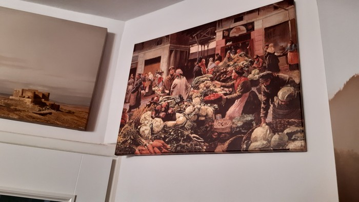 Dla równowagi na ostatnim kawałku wolnej ściany powiesiłem Halę Mirowską, jak ją widział Józef Pankiewicz 150 lat temu. W głębi Jan Himilsbach (z żoną).: