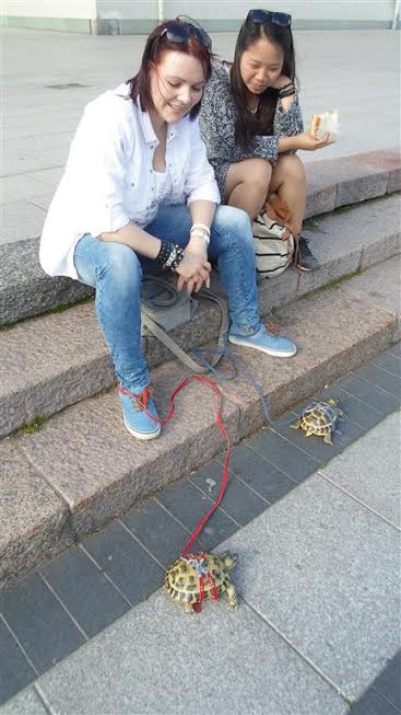 Upowszechnia się światowy obyczaj. Zapytałem tych pań Litwinek (z czego ta z prawej wydaje się rodowita), czy mogę pstryknąć zdjęcie, bo jak żyję nie widziałem tak pięknych żółwi. Na spacerze. W ostatniej chwili przypomniałem sobie, jak jest żółw po angielsku.: