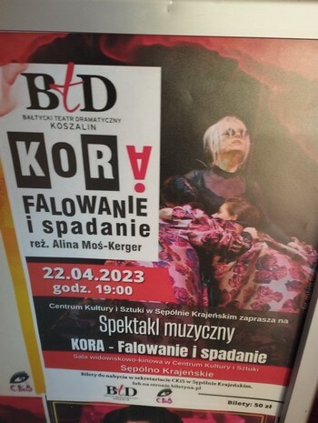 Sępólno Krajeńskie. W tamtejszym Domu Kultury (wcześniej byliśmy na niemym filmie z Polą Negri) sztuka Teatru Bałtyckiego z Koszalina „Kora. Falowanie i spadanie”.: