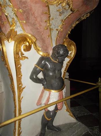 W tej samej bazylice historyczną ambonę z wizerunkami różnych świętych (białych, katolików) podtrzymuje biedny Murzynek w przepasce z liści. Tak, w Gostyniu wszystko jest na swoim miejscu.:
