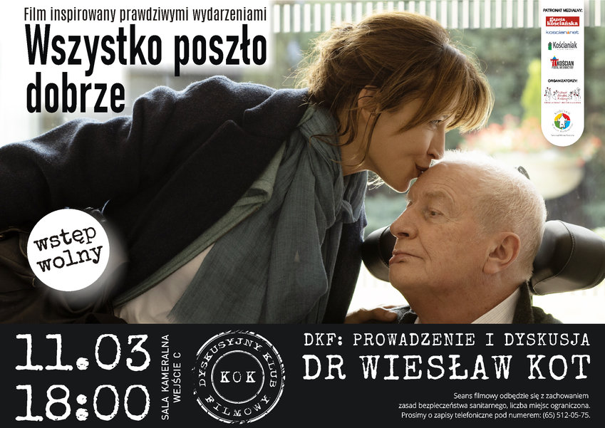 w Naszym DKF-ie kolejny poważny film na kolejny poważny temat. Taka już natura tych naszych spotkań. We francuskim filmie pod tytułem „Wszystko poszło dobrze” centralnym problemem jest kwestia eutanazji. Tutaj trzeba od razu przypomnieć, że tego rodzaju wspomagane samobójstwo, czyli eutanazja, jest we Francji ciągle nielegalna. Oto 85-letni, więc wiekowy mężczyzna , po długim i intensywnym życiu, zostaje dotknięty udarem i częściowo sparaliżowany. Nie mogąc się z tym pogodzić, prosi swoją najstarszą córkę Emmanuèle, aby pomogła mu popełnić samobójstwo, a ta z pomocą swojej młodszej siostry zaczyna skomplikowaną procedurę. Procedura ma zarówno charakter urzędniczy, jak i głęboko psychologiczny. A my oglądamy opowieść stonowaną, wyzbytą nadmiernej emfazy, celowo beznamiętną. Łza żalu pojawi się dopiero w ostatniej scenie.