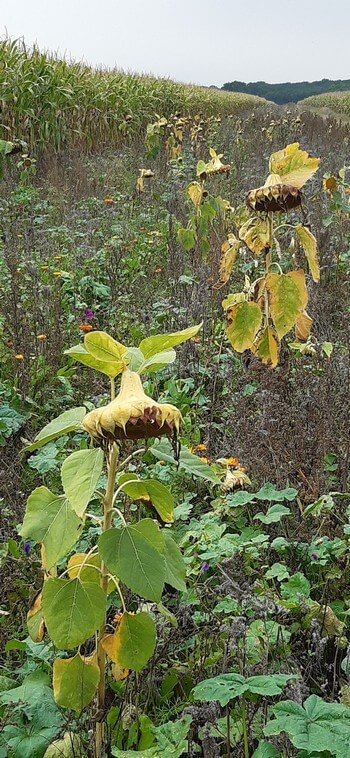 Słoneczko bladzieńkie, martwy motyl na ścieżce, słoneczniki łby pozwieszały, grunta zaorane.: