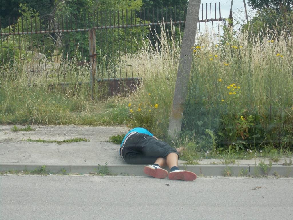 Ale wcześniej, omyłkowo, zajechaliśmy na targowisko miejskie. Pan leży na poboczu. Poszedłem sprawdzić, czy nie potrzebuje pomocy. Chrapanie słychać było jednak z daleka. Wyjeżdżając z miasta sprawdziliśmy, czy mu się nie pogorszyło. Nie. Przewrócił się tylko na plecy.:
