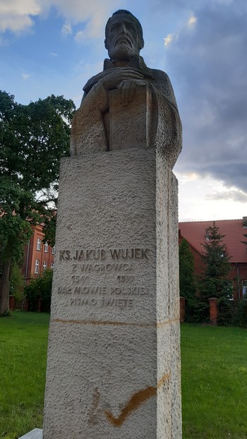 Wągrowiec. Z popiersiem ks. Jauba Wujka. Innym miejscowym, Stanisławem Przybyszewskim, jakoś mniej się tu chwalą. Przynajmniej w okolicach byłego opactwa cysterskiego.: